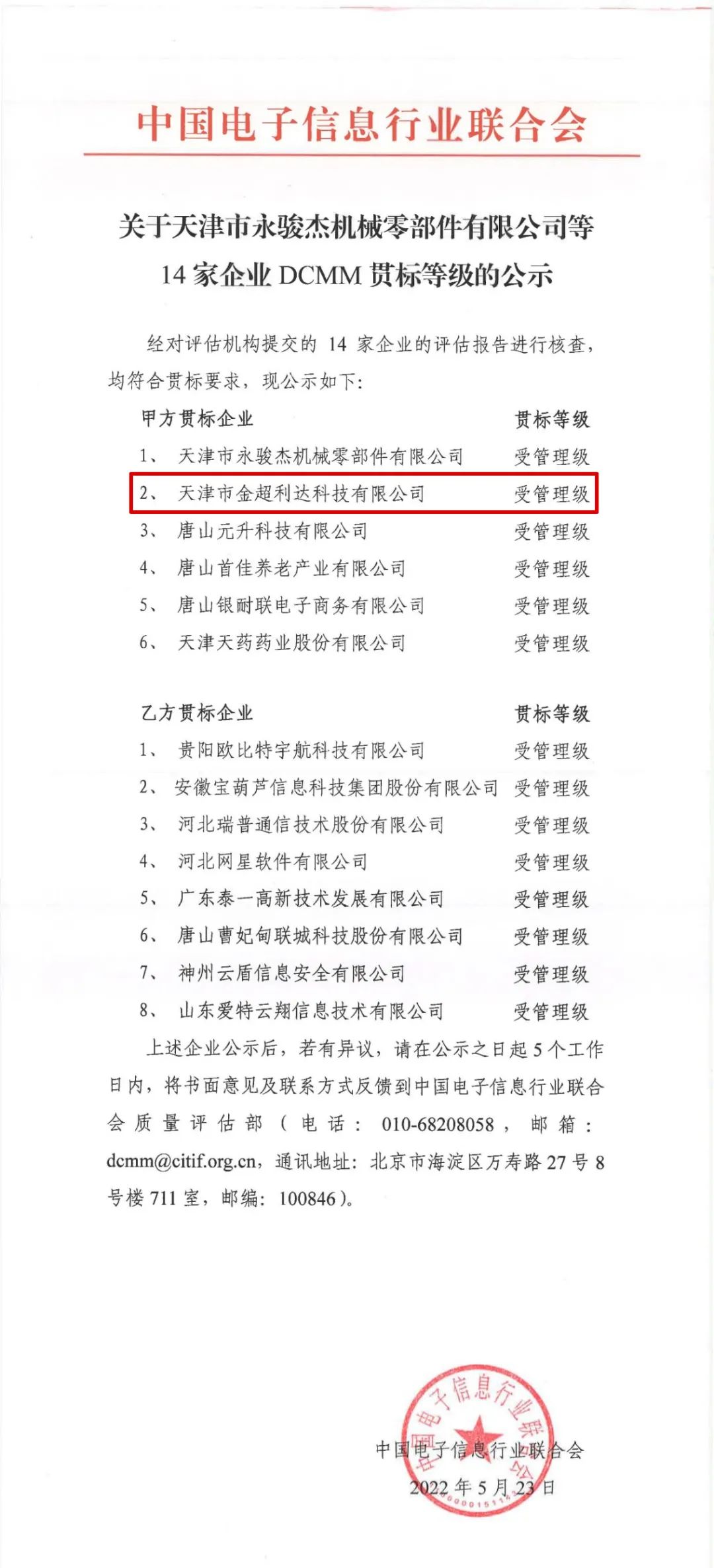 热烈祝贺金超利达荣获国家数据管理能力成熟度评估(DCMM二级评定认证),目前已进入公示阶段